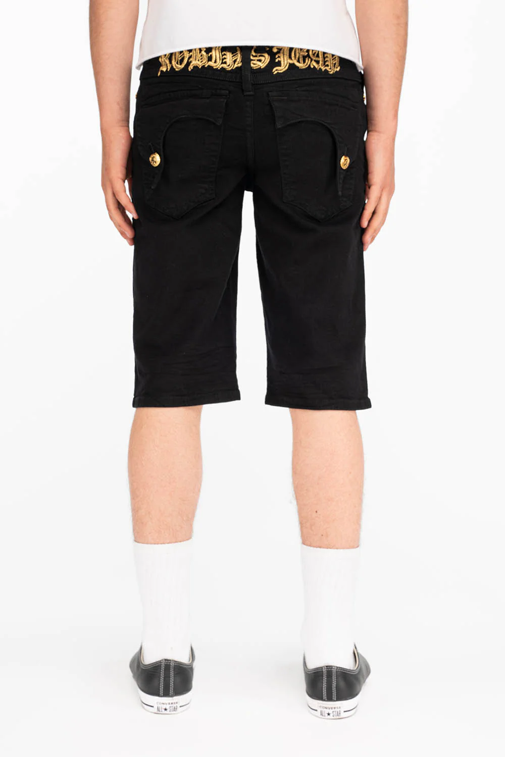 Robin's Killer Flap shorts in black with gold O.E. script. These shorts feature Robin's signature Killer Flap rear pockets, they are classic fit, and constructed using lightweight premium stretch denim for both comfort and style.