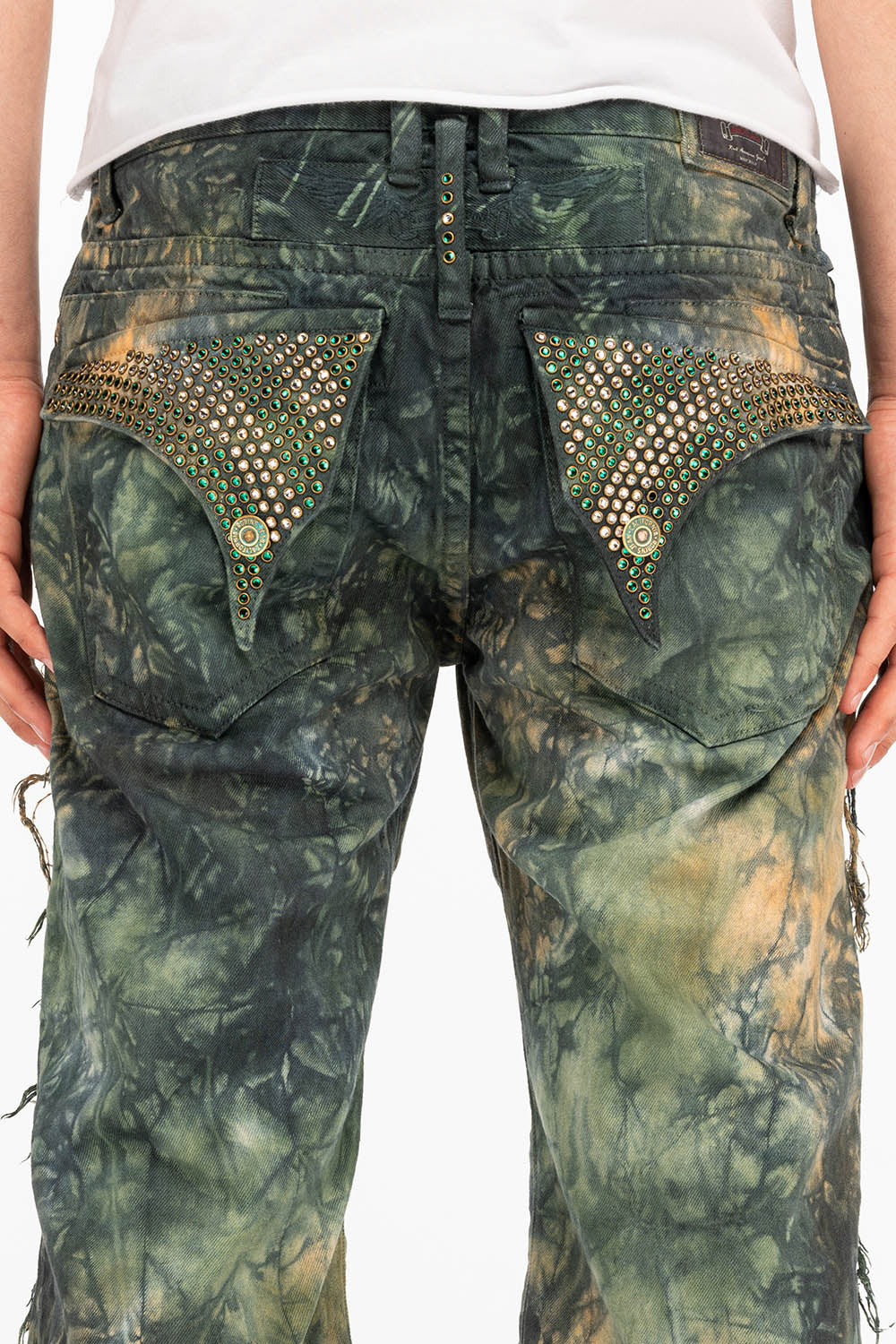Robin's Jeronimo wash destroy shorts. These shorts are fully destroyed, patched and washed using a special green tie dye wash treatment. They have signature fully embellished long flap pockets and are constructed using premium rigid denim for both style and durability.